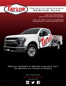 Preventive Maintenanc SERVICE PLAN 601-922-4444 www.taylorpower.com follow Us ARE YOU PREPARED? DON'T WAIT FOR AN OUTAGE CALL US TODAY FOR A GENERATOR INSPECTION & MAINTENANCE PLAN